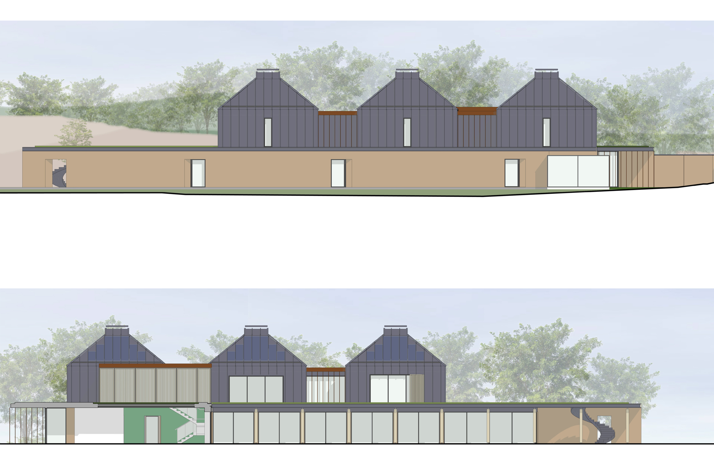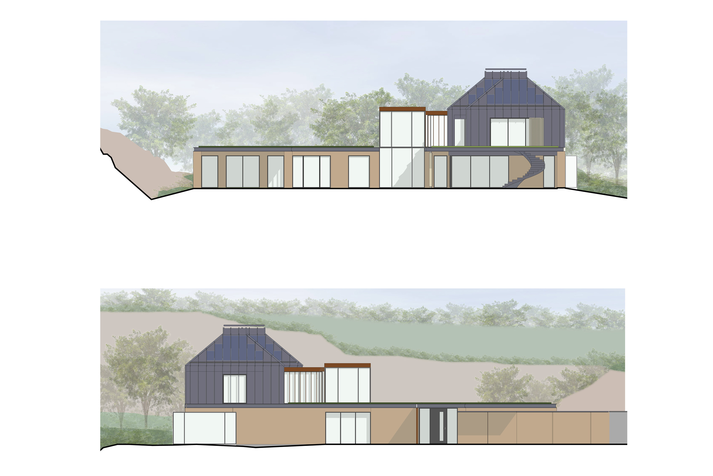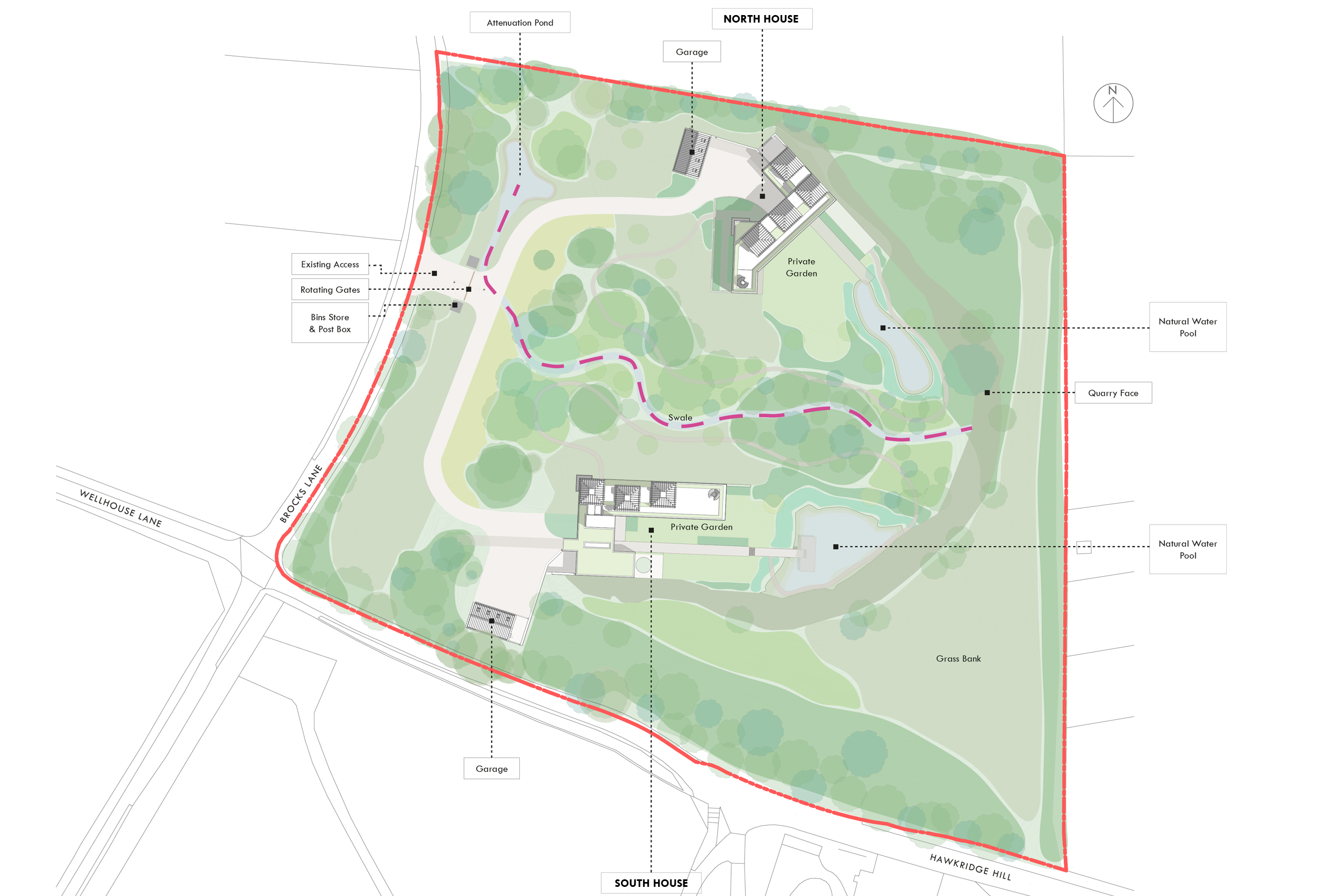 The site layout carefully locates two isolated dwellings arranged to maximise privacy and minimise visual intrusion towards neighbours and towards one another. An open swale acts as the demise line between north and south house plots, obviating the need for intrusive fenced boundaries.