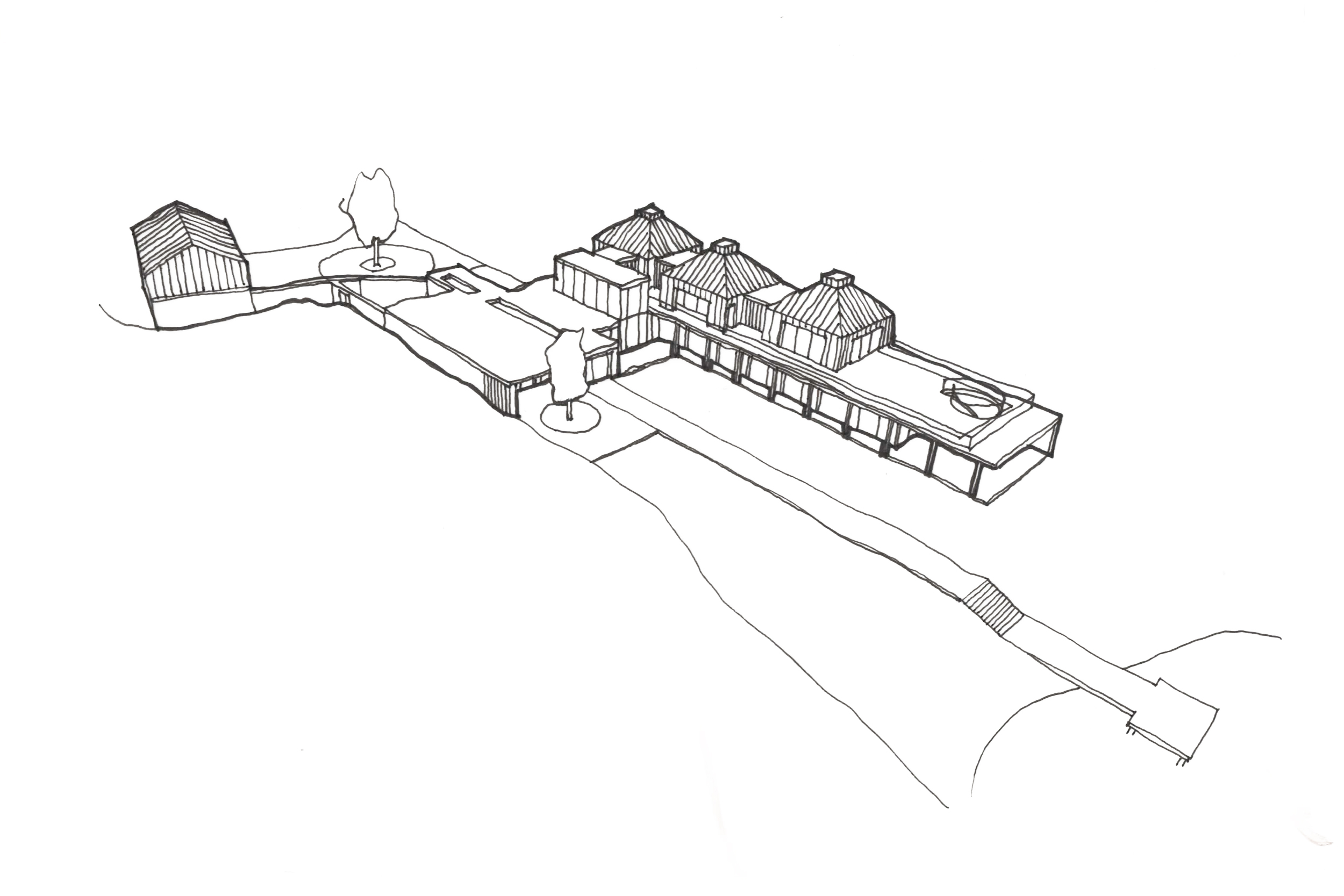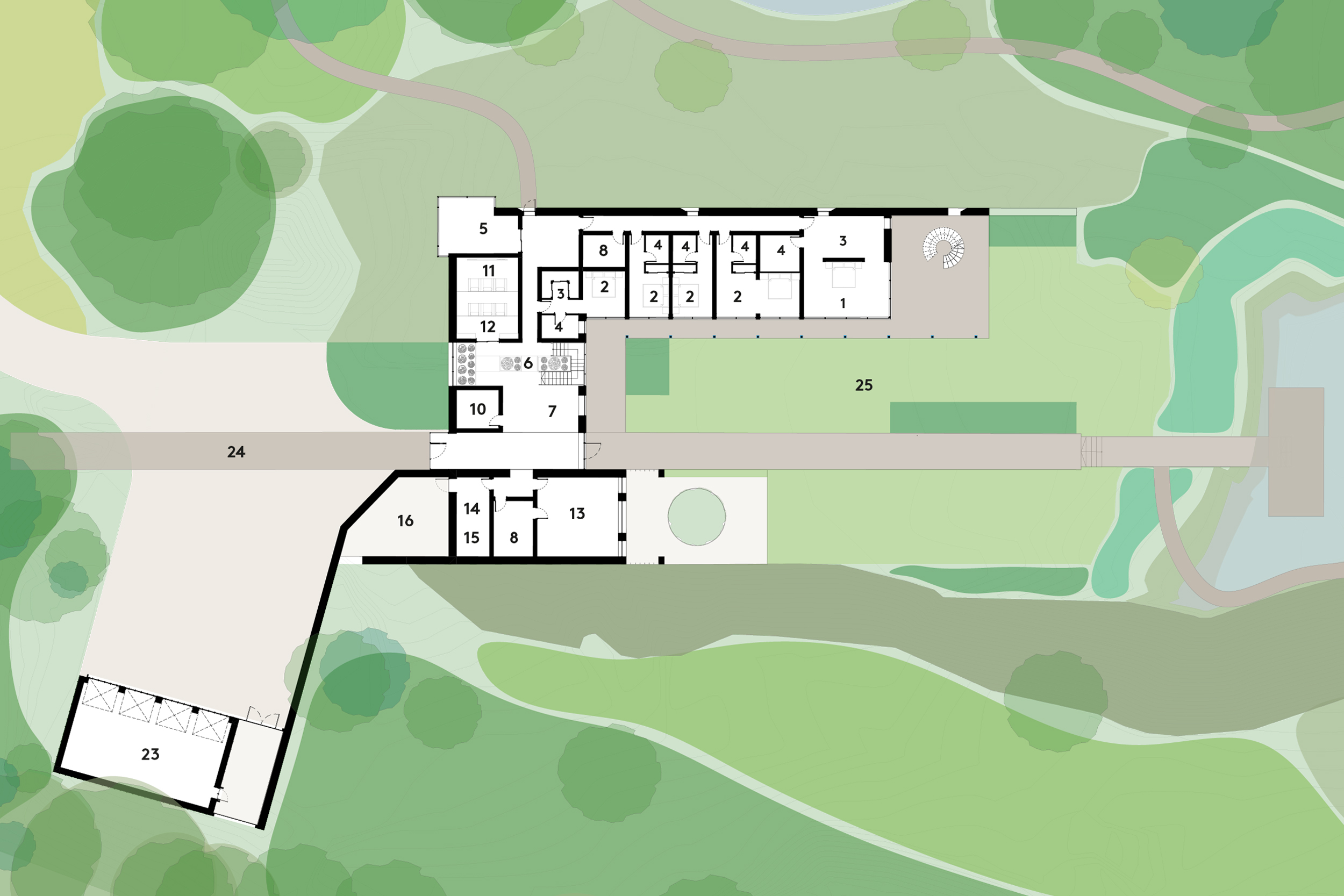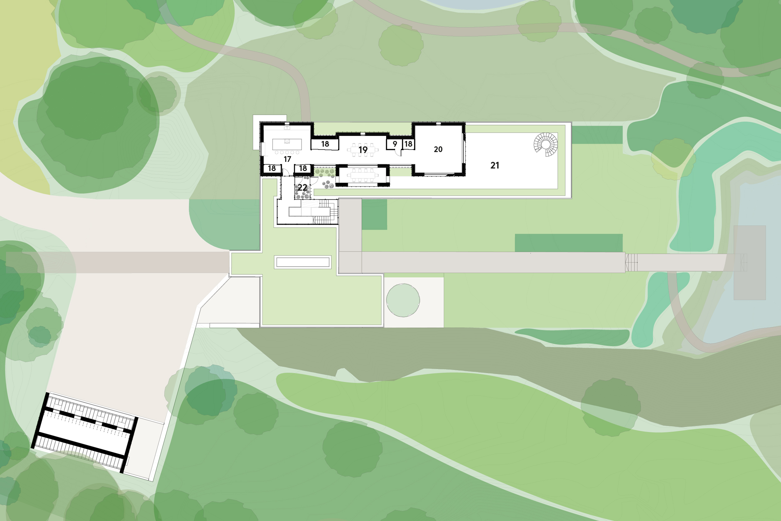 The arrival experience ascending a gravel drive into the green buffer contrasts with the more open more solid feel of the north house and glimpse views through to the gardens are created with glazed apertures.