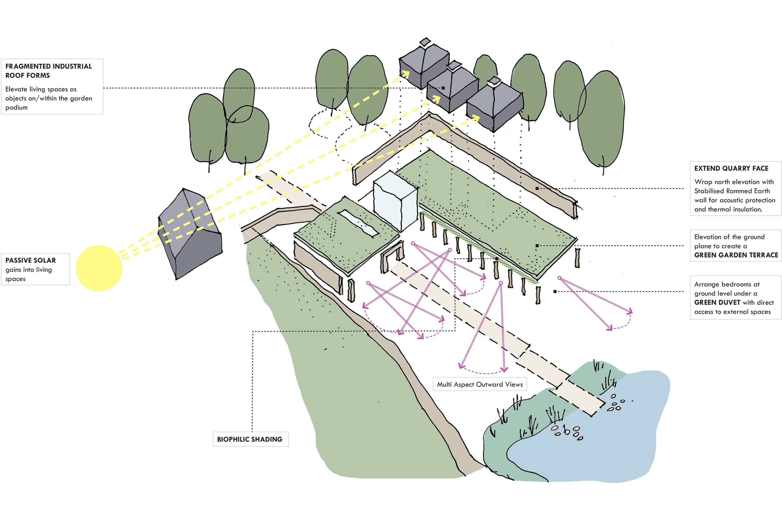 Each house takes the form of a green podium configured to act as a stop end to the expansive profile of the quarry face. Common characteristics will ensure a cohesive look and feel, each dwelling has a distinct identity.